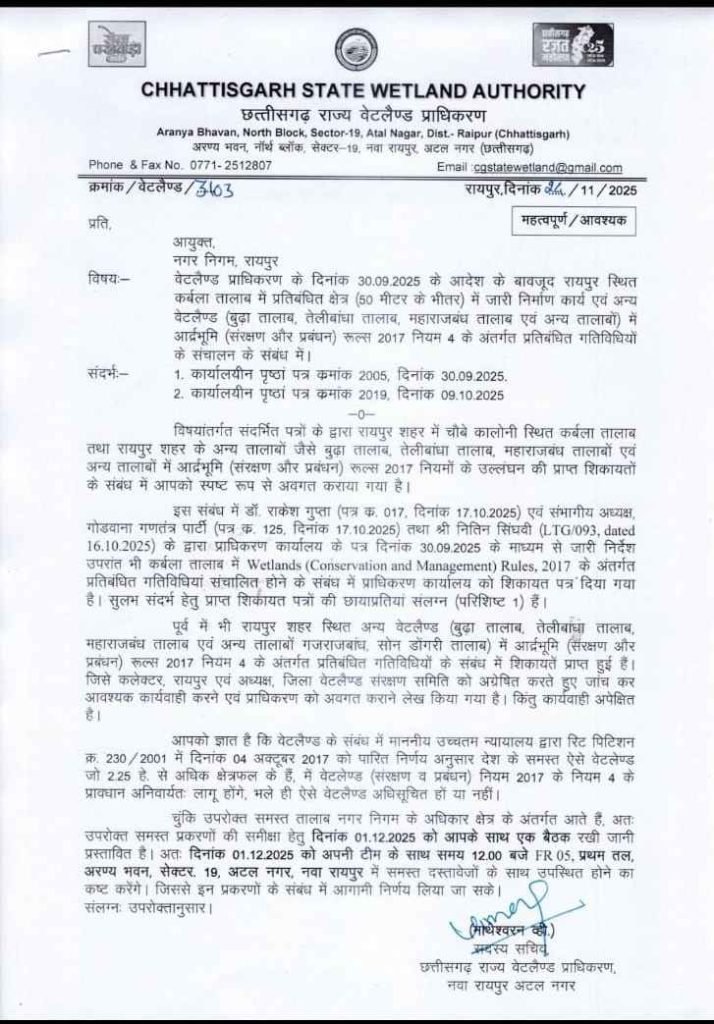 रायपुर। छत्तीसगढ़ राज्य वेटलैंड प्राधिकरण ने राजधानी के तालाबों के संरक्षण को लेकर कदम बढ़ाते हुए नगर निगम को 1 दिसंबर को बैठक में उपस्थित होने के लिए तलब किया है। यह बैठक मुख्य रूप से शहर के तालाबों के 50 मीटर के दायरे में हो रहे निर्माण कार्यों पर चर्चा के लिए बुलाई गई है।