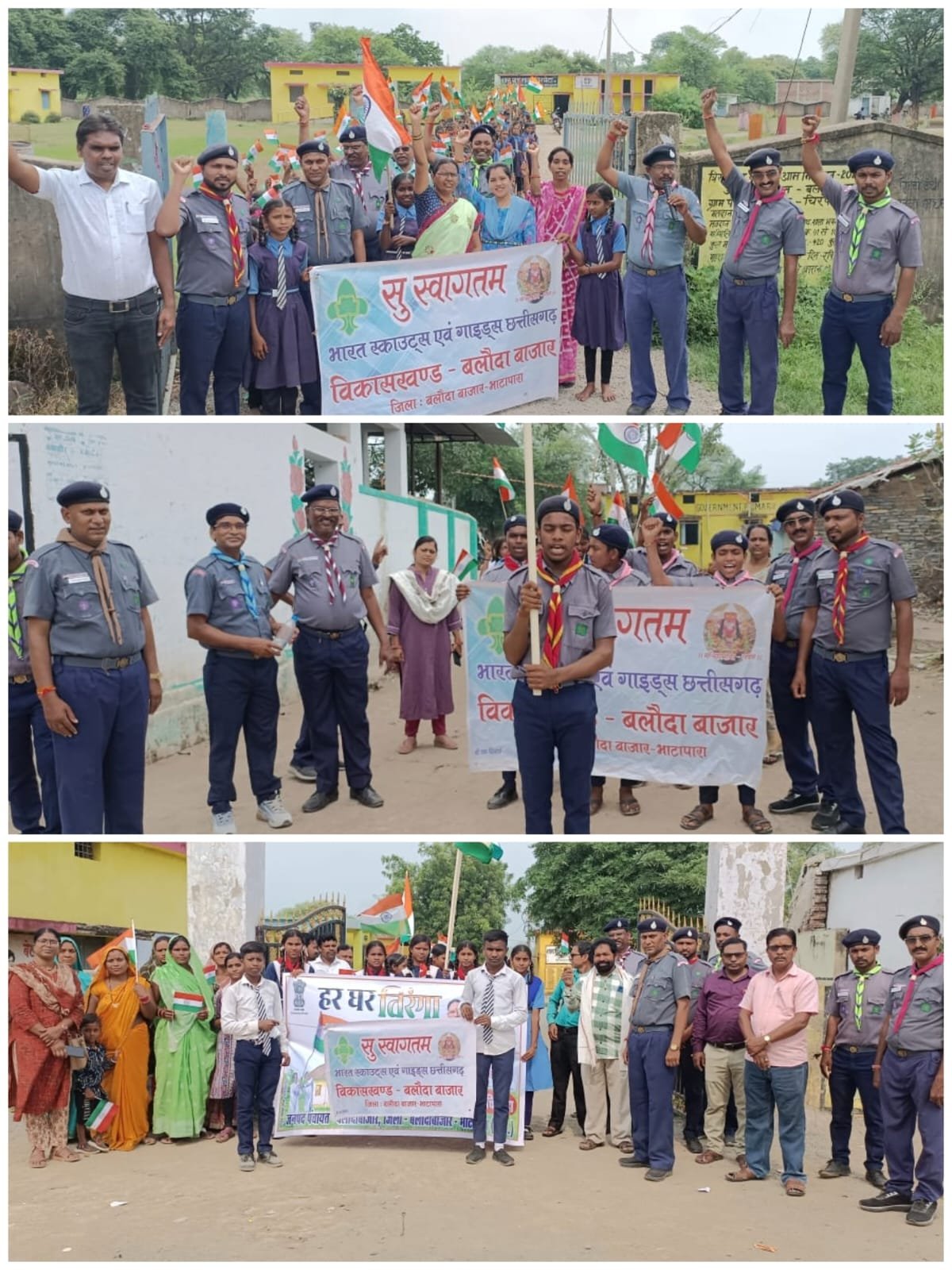 बलौदा बाजार | भारत स्काउट गाइड विकासखंड बलौदा बाजार के द्वारा शासन के मनसा अनुसार विकासखंड के समस्त स्काऊटर एवं गाइडर एवं स्काउट गाइड द्वारा विभिन्न स्कूलों का दौरा कर तिरंगा रैली एवं नशा मुक्ति अभियान का आयोजन की शुरुआत शासकीय प्राथमिक एवं पूर्व माध्यमिक स्कूल चिरपोटा से प्रारंभ कर गली चौक चौराहा में तिरंगे के महत्व एवं नशा से होने वाले नुकसान विषय पर नुक्कड़ नाटक प्रस्तुत करते हुए पूर्व माध्यमिक शाला एवं प्राथमिक शाला लाहोद जहां ग्रामीण एवं पंचायत के प्रतिनिधियों एवं स्कूल के बच्चों की संयुक्त तत्वाधान में ग्राम भ्रमण कर चेतना जागृत किया गया|