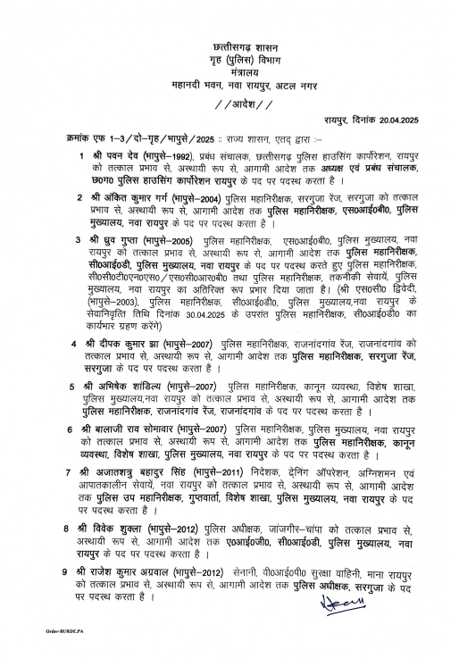 • सरगुजा और राजनांदगांव रेंज में आईजी के स्तर पर फेरबदल किया गया है।