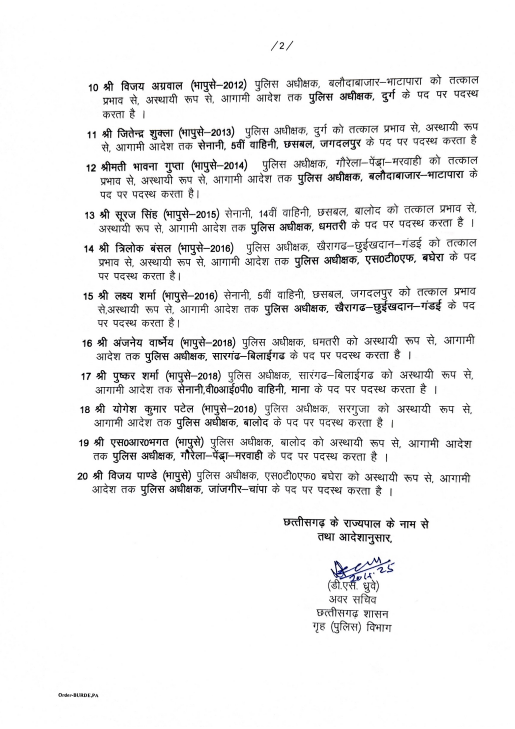 रायपुर। छत्तीसगढ़ सरकार ने एक बार फिर बड़ा प्रशासनिक फेरबदल करते हुए राज्य में 20 आईपीएस अफसरों का ट्रांसफर कर दिया है। इससे पहले शनिवार को 41 आईएएस अधिकारियों का भी तबादला किया गया था। दोनों ही आदेशों को लेकर सामान्य प्रशासन विभाग और गृह विभाग ने अधिसूचना जारी कर दी है।
